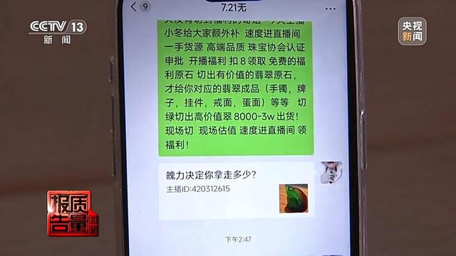 中国法学会消费者权益保护法研究会副秘书长 陈音江:珠宝属于贵重的商品,本身在线下交易的时候都容易出现纠纷,如果通过远程的方式来销售,因为是异地经营,出现这种问题的风险就会更高。特别提醒消费者,一定要慎重通过网络直播带货的方式来购买珠宝玉石等贵重物品,尤其是不要去相信主播或者商家的所谓捡漏或者打折宣传的噱头,更不要脱离平台进行私下交易,否则出现问题之后往往很难维权。