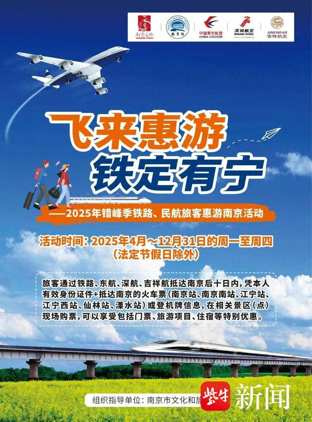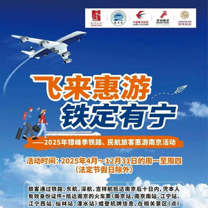 这一次,活动再“升级”。为充分发挥南京的交通枢纽优势,促进“交通+旅游”深度融合,引导更多海内外游客在非节假日错峰抵宁畅游,在此前活动基础上,南京市文旅局积极沟通协调,联动铁路、民航与南京地区25家旅游景区景点再度合作,推出“飞来惠游 铁定有宁”2025年错峰季惠游南京活动。