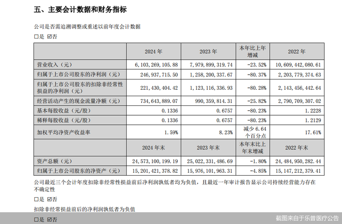 乐普医疗2024年年报显示,2024年,公司实现营业收入约为61.03亿元,同比下降23.52%;对应实现的归属净利润约为2.47亿元,同比下降80.37%;对应实现的扣非后净利润约为2.21亿元,同比下降80.28%。