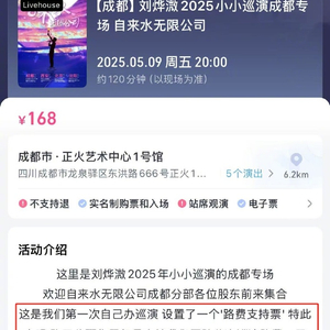 4月20日,有网友发现,歌手刘烨溦巡演设置“路费支持票”,票价高达1688元,而其巡演入场门票售价仅168元,“路费支持票”价格超入场门票十倍。