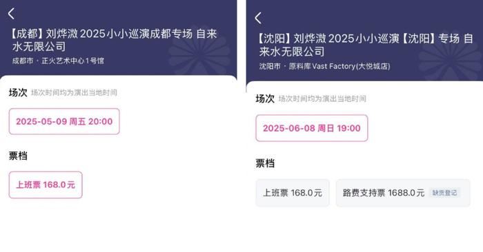 20日,购票平台显示,成都场“路费支持票”已下架,沈阳场显示其已缺货。