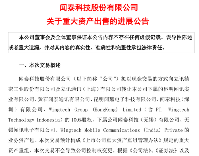 此次交易涵盖昆明闻讯、黄石闻泰等9家子公司100%股权,以及无锡、印尼等地业务资产包,涉及手机、笔电等消费电子产能。