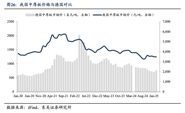 国内钢材价格较低,成本优势大。目前单桩成本中,原材料中厚板等成本占比在70~80%,钢材价格波动对于单桩价格和业主成本影响较大。对比我国和德国中厚板市场价,2025年2月我国中厚板单价约3486元/吨,德国中厚板单价约748美元/吨(按照7.3汇率计算,约合人民币5460元/吨)。对比我国生产制造运输和欧洲本土生产制造来看,我国单桩厂商具备更强的原材料成本、加工费优势,即使相比欧洲本土生产制造多出运费部分,节省的原材料成本和加工费可与新增的运费相抵消。