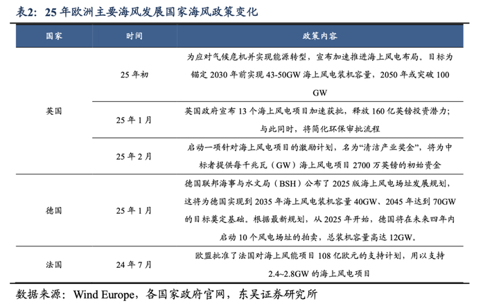 2024~2025年,欧洲主要海风发展国家也陆续发布海风相关政策:1)英国:25年初宣布加速海风布局,锚定2030年前实现43-50GW海风装机,虽相较2022年上调后的预期有所下调,但整体成长基调尚未改变;25年2月英国政府启动2700万英镑的激励计划以促进海风开发建设。2)德国:25年初德国联邦海事与水文局公布海风场址发展规划,将在未来4年释放12GW拍卖量;3)法国:欧盟批准了法国针对海风108亿欧元的支持计划。