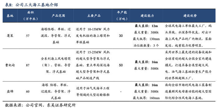 曹妃甸海工基地,专注深远海技术与超大构件生产。唐山曹妃甸基地占地约87万平方米,配备3000吨级吊机及全球首创的超大分段全室内建造产线,年设计产能50万吨,核心设备100%由欧洲进口。基地主要专长于超重塔筒、特大型单桩基础、超大型导管架以及浮式基础,规划配备多个重装泊位,适用于15-25MW风力发电机组,可满足未来10年全球对海上风电前沿产品的需求。