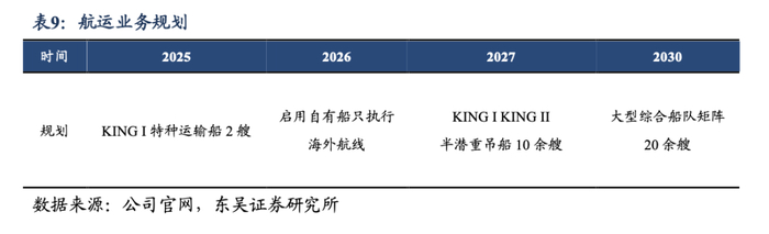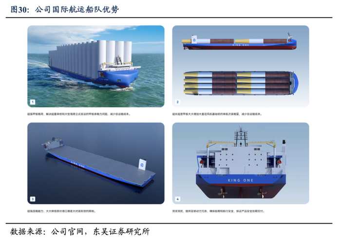 自建特种运输船队构建全球化物流体系。公司依托盘锦海工基地的船舶建造优势,独创设计并建造载重量超5万吨的海上风电装备特种运输船。其型宽51米、总长240米的船体规格显著提升单次运载效率。目前一期2~4条甲板驳船已经开始打造,2025年有望陆续交付2艘海上风电装备特种运输船,首批两艘船舶交付后,公司将陆续启动10-20艘超大型运输船队建设,将于2026年启用自有船只执行海外航线。
