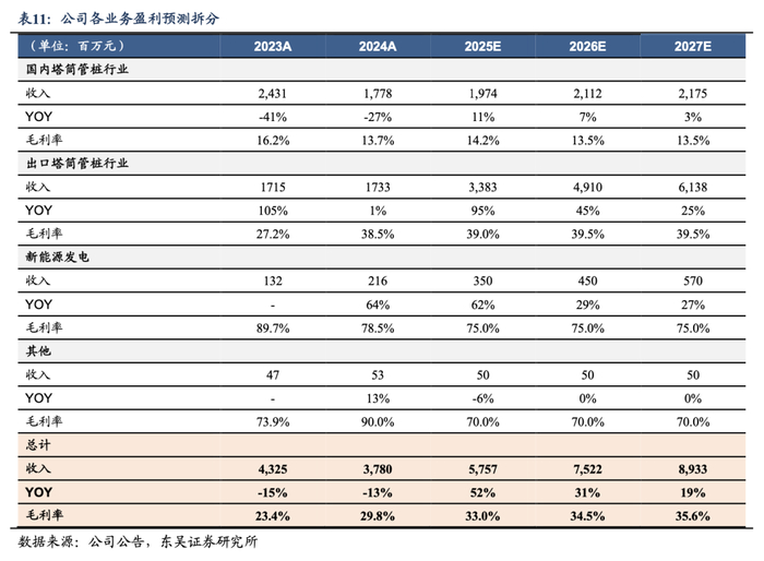 出口塔筒管桩行业:该业务为公司最主要的收入、利润来源。根据在手订单排期,预计25、26年公司出货分别约15、25万吨,单吨价格小幅上涨,预计交付项目中TPLess占比继续提升,预计毛利率持续提升。我们预计2025~2027年出口塔筒管桩业务收入分别为33.83/49.10/61.38亿元,增速分别为94%/45%/25%,毛利率39.0%/39.5%/39.5%。