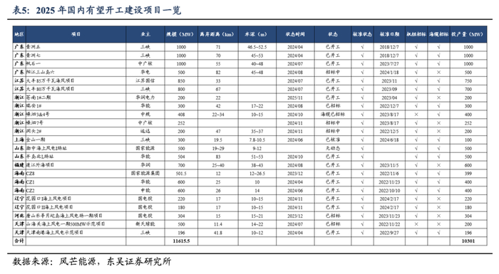 预计25年海风装机10~12GW,同比实现翻倍以上增速;其中已开工项目达到8.4GW+,全年装机确定性强。
