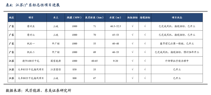 部分标志性项目已启动开工,25年装机确定性强。1)江苏2.65GW项目进展:1月8日,江苏省发改委公布《2025年江苏省重大项目名单》,涉及11个新能源发电设施项目,包括国信大丰850MW海风项目、三峡大丰800MW海风项目、龙源射阳1GW海风项目,当前两个大丰项目已启动正式开工,射阳项目完成外部手续办理后将启动开工,项目解决方向已明确。2)广东青洲五七/帆石一二项目进展:目前青洲五七、帆石一二项目均已完成风电机组、海缆招标。25年1月24日,帆石一项目首台风电基础开始打桩,标志着该项目进入桩基工程施工阶段。2月26日,打桩船“铁建起重5000”启航,预计于3月6日抵达广东阳江,执行三峡阳江青洲五海上风电场项目标段Ⅱ打桩任务,同样已启动开工。