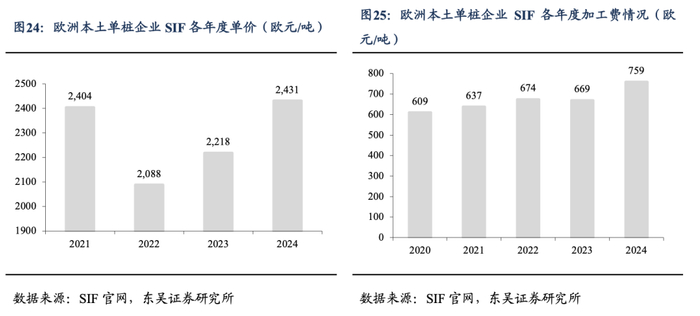 从海外本土厂商SIF的情况来看,欧洲项目单桩交付订单处于上涨趋势。22~24年SIF交付单桩单价分别达到2088、2218、2413欧元/吨(约合1.9~2.3万元/吨),剔除原材料波动后的加工费约674、669、759欧元/吨,边际价格持续上涨。