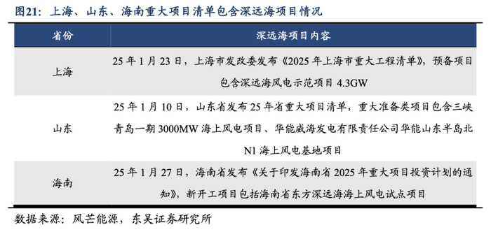 深远海启动在即,看好“十五五”成长空间。专属经济区,也可以称为国管海域。我国领海基线以外12海里为我国领海区域(即省管海域),12~200海里海域为专属经济区(国管海域,即22~370km)。根据《漂浮式风电技术现状及中国深远海风电开发前景展望》,中国50m水深近海范围内,风电技术可开发资源量4.3亿kW(合430GW),水深超过50m的深海风电技术可开发资源量超过20亿kW(合2000GW),相当于近海风资源的4~5倍。2025年1月2日,自然资源部发布《关于进一步加强海上风电项目用海管理的通知》,25年国管海域用海政策开始出现积极变化;该通知首次明确国管海域用海批复,先由自然资源部办理用海预审,核准后报正式用海审查,即基本明确国管海域项目用海批复流程,行业审批掣肘逐步清晰。2025年,上海、山东、海南等各省(市)陆续发布25年重大工程清单,分别包含深远海示范项目4.3、3、2~3GW,我们预计“十五五”期间有望带来更大增量,预计年均装机达15~20GW。