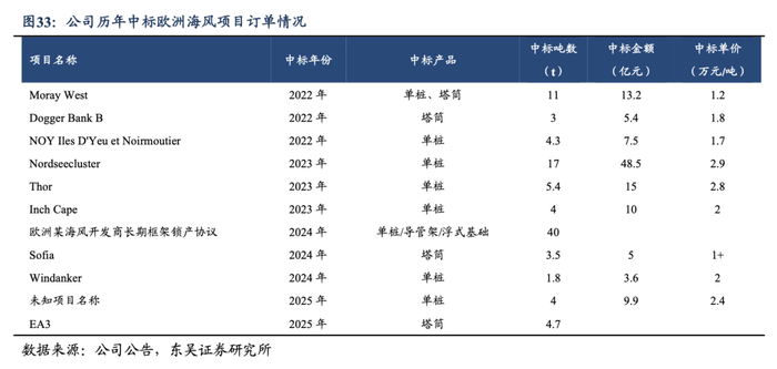 入围头部业主供应商名单,海外客户资源优质。公司2009年提出两海战略发展目标,2018年逐步做出口的努力,经过多年努力完成多个欧洲海风业主的审核。目前已经进入5大欧洲业主的合格供应商名单,包括RWE、沃旭、Iberdrola、OceanWinds、SSE。目前公司产品出口全球三十多个国家和地区,包括英国、德国、法国、丹麦、日本、韩国、越南、意大利、智利、挪威、芬兰、印度、加拿大、澳大利亚等,通过自身过硬的产品质量和完善的服务体系赢得了优质的信誉和市场口碑。在保持现有欧洲市场竞争实力的同时,公司正在欧洲、东南亚等地区不断拓展和接受新的海外客户认证,公司在手海外订单全球排名领先。2023~2024年公司新增订单分别为30、5万吨,25年至今在新增订单近9万吨,当前在手订单中明确项目的合同约40万吨、长期框架锁产协议40万吨。目前囤积未开标订单较多,叠加日本海风项目亦在招标流程中,预计2025年公司迎来订单密集落地期。