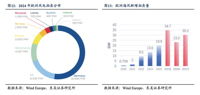 1)拍卖:拍卖是项目释放的最前期环节,一般而言项目获得拍卖后,有望在未来4~5年期间实现装机并网。根据Wind Europe数据,到2024年底,欧洲风电新增拍卖36.8GW,其中德国授予容量最多达到19GW,其次英国6.3GW、荷兰4.1GW。拆分来看,陆风拍卖量17GW,海风拍卖量20GW,海风拍卖量同比增长46%,已连续4年实现高增。根据4C offshore报告,预计2025-2027年,欧洲海上风电项目拍卖量将继续保持增长态势,分别达到2025年34.7GW、2026年23.2GW、2027年30.2GW,相较2021年的2GW翻数十倍规模。