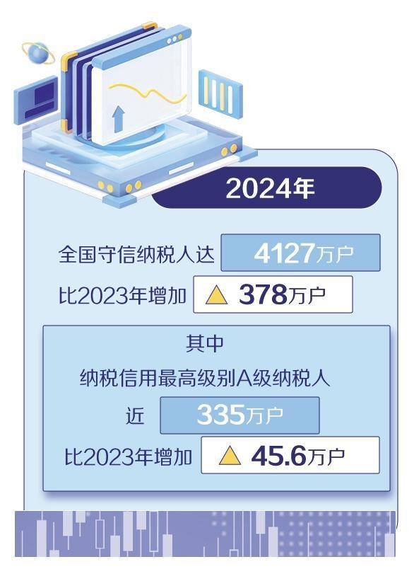 2024年发布的全国纳税信用年度评价结果显示,全国守信纳税人达4127万户,比2023年增加378万户,其中纳税信用最高级别A级纳税人近335万户,比2023年增加45.6万户。“数据体现了我国纳税信用体系正向激励成效显著。”张巍表示,企业维护A级纳税信用资质可有效降低运营成本,增强市场竞争力。
