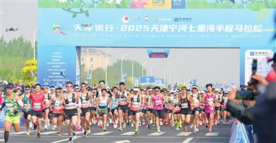 本报讯(记者 苏娅辉 摄影 孙震)昨天,天津银行·2025天津宁河七里海半程马拉松在未来科技城麒麟广场举行。这场由中国田径协会认证的A1类赛事,以“湿地画廊·畅跑宁河”为主题,吸引了15000名跑者齐聚宁河。