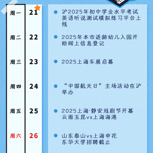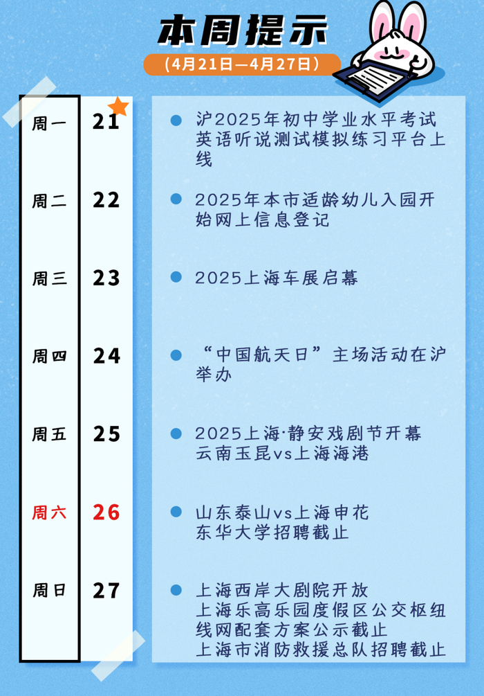 敲黑板!4月27日(星期日)是工作日,大家记得要上班~2025本市适龄幼儿入园周二起进行网上信息登记,2025上海车展周三启幕,“中国航天日”主场活动周四举办,上海西岸大剧院周日开放……本周还有哪些大事?速看本周提示↓
