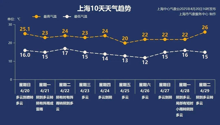 周二夜间雨止,本周中后期将以多云天气为主。周中气温平稳,最高气温在23-24度附近,最低气温14-15度之间。需要注意的是周五附近最高气温有所回落,全天气温在13-20度。本周气温整体在舒适区间,大家要抓紧享受美好的春天呀。