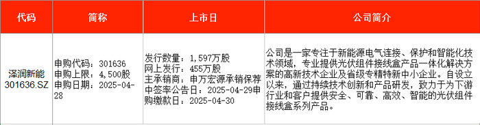 从时间表看,本周暂无新股申购,也没有新股上市,泽润新能(301636)则在周二(4月22日)询价。