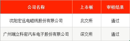 发审委审核方面,深交所、北交所上周均召开新一期上市审核委员会审议会议。其中,拟在北交所上市的沈阳宏远电磁线股份有限公司(下称“宏远股份”)成功过会,拟在深交所上市的广州瑞立科密汽车电子股份有限公司(下称“瑞立科密”)也成功过会。