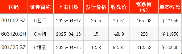 4月15日,信凯科技在深圳证券交易所主板正式挂牌上市,发行价为12.8元/股,截至上市首日收盘,该股报52.81元/股,涨幅为312.58%。以收盘价计算,投资者中一签浮盈为20005元。