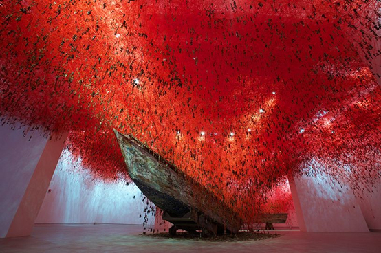 盐田千春是日本当代艺术家,以使用线绳和织物创作大型装置闻名。
