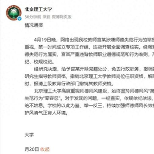 北京理工大学20日在其官方微博发布声明称,4月19日晚,网络出现我校教师宫某涉嫌师德失范行为的举报信息,学校高度重视,第一时间成立专项工作组,连夜开展全面调查核实。经调查,举报的宫某师德失范行为属实,宫某严重违背教师职业道德规范和行为准则,严重违反党规党纪、校规校纪。
