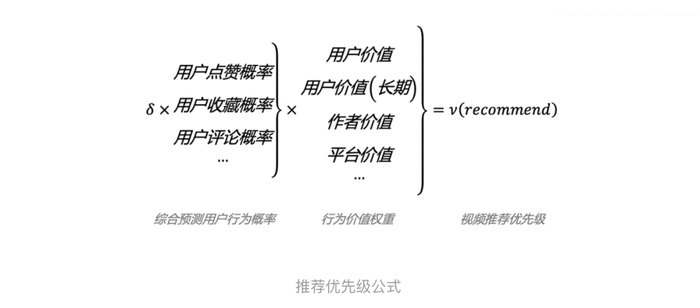 其实价值也很好理解,比如长视频的完播率肯定不如短视频的完播率高,如果按照用户行为指标来计算,那短视频的推荐会大大高于长视频,但是长视频消耗用户的时长、输出的内容要比短视频多,所以平台为了权衡两者的差距就会对长视频的完播率的行为指标进行加权。