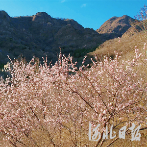 4月3日,山海关角山景区绽放的山桃花与远处的长城同框,美景如画。河北日报、河北日报客户端记者孙也达摄