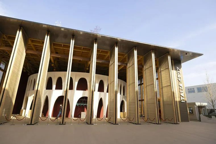 意大利馆堪称一座“文化的剧场”。场馆外观是一座三层木结构建筑,重现了意大利标志性的剧场、广场和花园。
