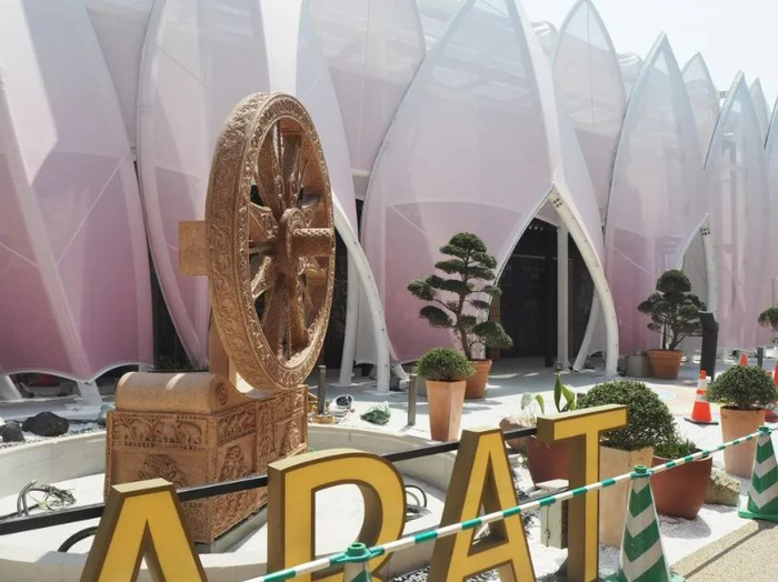 印度馆的外观以恒河为设计灵感,蓝白波浪交织,入口处是巨大的莲花浮雕,象征智慧与纯净。
