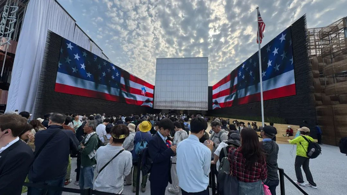 美国馆坐落在世博会东入口广场与“宁静森林”之间,位置绝佳,步入会场就能一眼看到它。它由美Trahan Architects设计,场馆外观采用了日式“侘寂”美学,强调简约与不完美之美。两座三角形木质建筑对称排列,中间悬浮着一个发光的透明立方体,仿佛漂浮在空中,夜晚时散发柔和光芒,宛如一颗指引未来的星辰。两座建筑的外墙上,各镶嵌了一块高达9.45米的巨型LED屏幕,循环播放美国标志性的自然景观与城市地标,从大峡谷的壮丽到纽约的繁华,令人目不暇接。