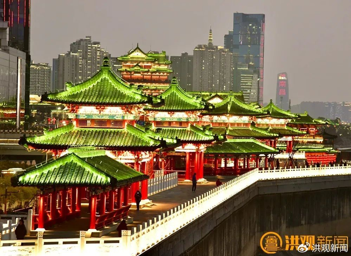 信步新拓的临江长廊,恍若步入青绿卷轴——唐风宋韵次第舒展,檐牙衔住流云,朱栏挽起烟波。当暮色浸透飞阁,288米灯笼长墙忽而苏醒,将《滕王阁序》熔作星河倾泻。更妙的是,九成区域免票迎客,令市井烟火与琼楼玉宇共沐江风……