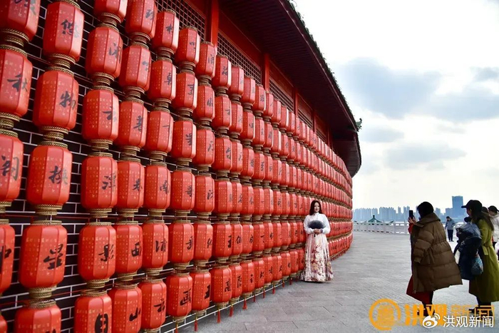不仅如此,滕王阁景区“还江于民、还岸于民、还景于民”及北扩工程打通了滕王阁与八一大桥、大士院老街的交通网络,市民可直达大士院,或沿滨江步道漫步,尽览“豫章十景”章江晓渡与“一江两岸”风光。家住榕门路的市民李思唯感慨道,“现在推窗见阁,‘抬脚到江’,我每天早上都来跑步,晚上还会带家人来散步,看灯笼墙。”她口中的灯笼墙,便是滕王阁景区热门打卡点之一。灯笼墙阵列呈现,白天是装点唐风建筑群的朱红屏风,入夜便化作流淌的《滕王阁序》光影长卷,令人恍若穿越千年与古人对话。