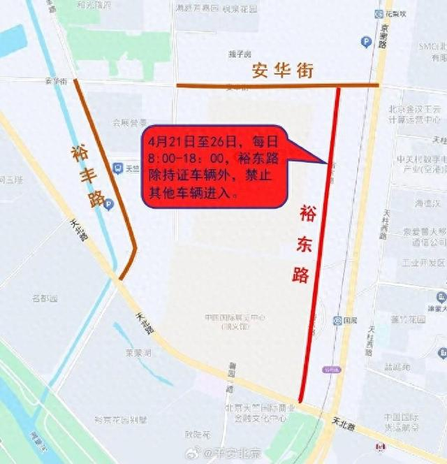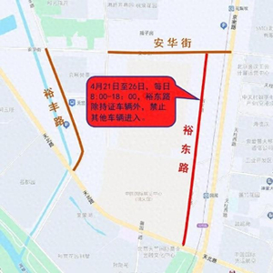 二、展会期间每日8时至18时,裕东路(天北路至安华街路段)采取临时交通管制措施,除持证车辆外禁止其他车辆进入;裕丰路(天北路至安华街路段)、安华街(裕安路至京沈路路段)在管控时段内将根据车流量适时采取临时交通管理措施。