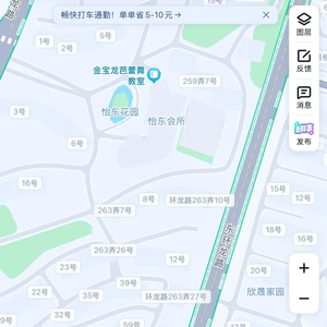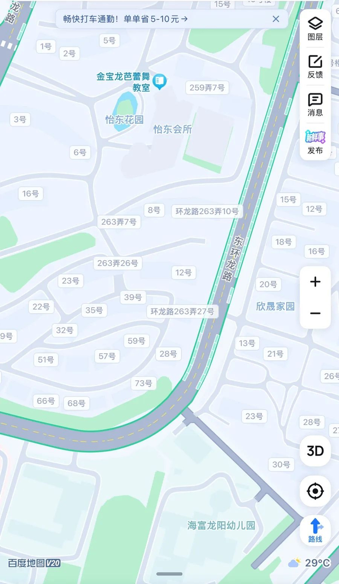 图为东环龙路部分路段地图。图上下方为交大附属浦东实验小学北校和海富龙阳幼儿园,地图上路边的方块即为道路停车车位。