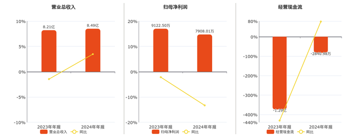 公司营业总收入为8.49亿元,在已披露的同业公司中排名第13。归母净利润为7908.01万元,在已披露的同业公司中排名第13,较去年同报告期归母净利润减少1214.49万元,同比较去年同期下降13.31%。经营活动现金净流入为-2840.98万元,在已披露的同业公司中排名第16。