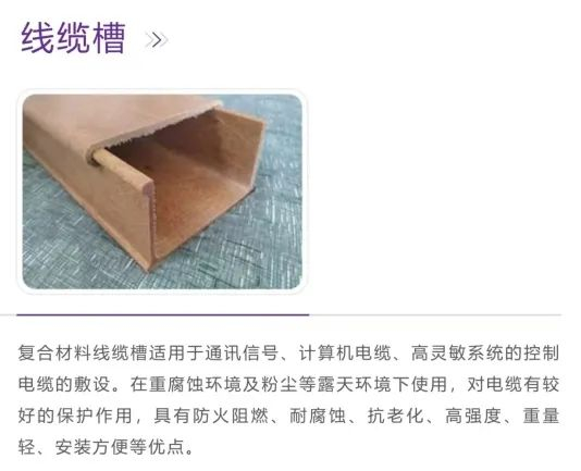 复合材料线缆槽及防护罩是由连续玻璃纤维与增强树脂通过拉挤或模压工艺制作而成,是一种可取代金属材料、塑料材料的新型复合材料制品。机械性能优良,外形美观,色泽多样。