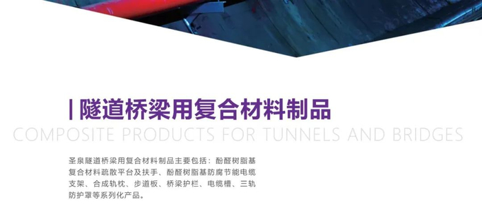圣泉隧道用复合材料制品主要包括:酚醛树脂基复合材料疏散平台及扶手、酚醛树脂基复合材料电缆支架、合成轨枕、电缆槽、三轨防护罩等系列化产品。