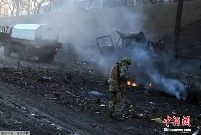 当地时间2022年2月26日,乌克兰军队在乌克兰首都基辅与俄罗斯突袭小组发生战斗。图为交火后,乌克兰军人收集未爆炸的炮弹。