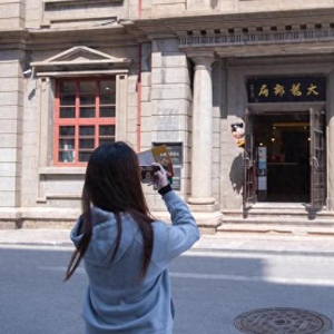 2025年4月,游客在烟台大龙邮局建筑前拍照。曲正扬 摄