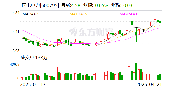 国信证券04月21日发布研报称,给予国电电力(600795.SH,最新价:4.58元)优于大市评级。评级理由主要包括:1)营业收入小幅下降,归母净利润大幅增长;2)火电发电量同比下降,光伏发电量同比大幅增长;3)新能源稳步发展,装机规模持续增长。风险提示:用电量下滑;电价下滑;项目投运不及预期;煤价上涨;来水情况较差;行业政策变化。