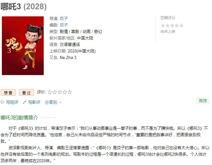 豆瓣网站则显示,《哪吒3》上映时间目前备注为2028年。