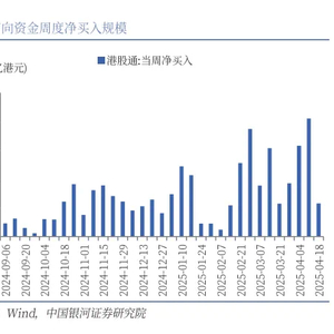 从估值角度来看,上周港股估值总体上升,但仍处于历史中低水平。截至4月17日,恒生指数的PE、PB分别为9.6倍、1.02倍,分别较前一周五上涨2.49%、2.50%,分别处于2019年以来42%、55%分位数水平。恒生科技指数的PE、PB分别为20.16倍、2.75倍,分别处于2019年以来8%、54%分位数水平。
