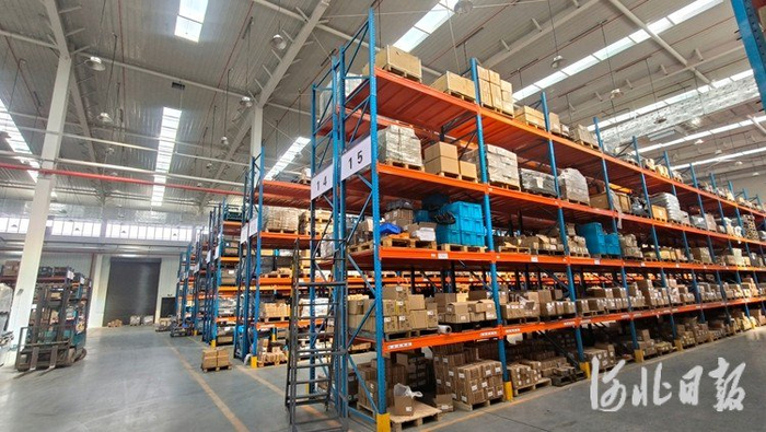 在安次区高新技术产业园区,瑞立美联制动技术(廊坊)有限公司(以下简称“瑞立美联”)年产160万台空压机、150万套水泵及50万台新能源空压机建设二期项目现场同样一片繁忙,工人们正将刚生产出来的空压机等产品一箱箱摆放到仓库货架上。