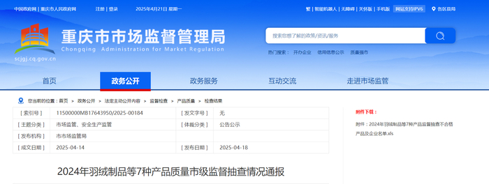 中国质量新闻网讯 近日,重庆市市场监管局发布2024年羽绒制品等7种产品质量市级监督抽查情况通报。