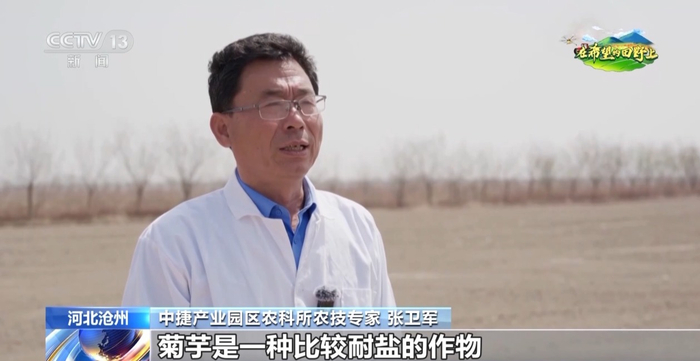 中捷产业园区农科所农技专家 张卫军:菊芋是一种比较耐盐的作物,通过它的种植可以把土壤中的盐分带走,它的秸秆可以还田,增加土壤中的有机质含量、增加土壤的透气性,从而达到改良盐碱地的作用。通过一年的种植情况来调查看,菊芋种植以后,土壤含盐量降低了0.2%。