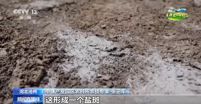 中捷产业园区农科所农技专家 张卫军:这块地,是我们采取一个秸秆深埋阻盐技术。埋秸秆的透气性强,盐分没有溢到地表来。而这一溜底下没有埋秸秆,它的盐分随着水分上升都泛到地表了,这形成一个盐斑。