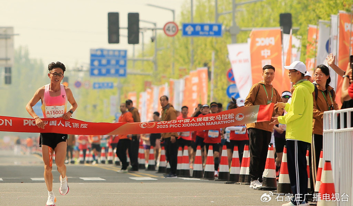 4月20日,2025雄安马拉松赛上,选手洪跃在终点闯线,以2小时18分43秒的成绩获得本届马拉松男子组冠军。河北日报客户端记者 刘光昱 摄