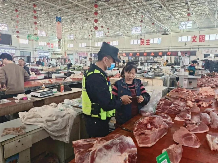 行动期间,各警种部门民警辅警走进辖区各市场,通过现场讲解、发放宣传资料等方式,向商铺、摊贩以及消费者等群体,普及《中华人民共和国食品安全法》等相关法律法规,要求肉类产品经营者依法依规经营,自觉抵制销售伪劣肉类产品和假冒伪劣食品的不法行为。