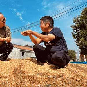 宋国庆(左)向村里种粮大户了解粮食增产丰收情况。